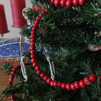 "I thought that washed off during the last rainstorm you were caught out in..." I said. "I've been using that coverstick you have to cover it up..." said Mr. Skellie. "You mean the one I used to use to cover my eye bags...I've been wondering where that went..."I said. He said he feels like Popeye when he lets it show. I told him Popeye had arms that were a whole lot bigger but he came back with the comment that the bones were the same size. You can't win when you try to argue with a plastic skeleton I guess. We continued working on the ornaments together and after it was all done, I saw him looking at the tree and thinking.